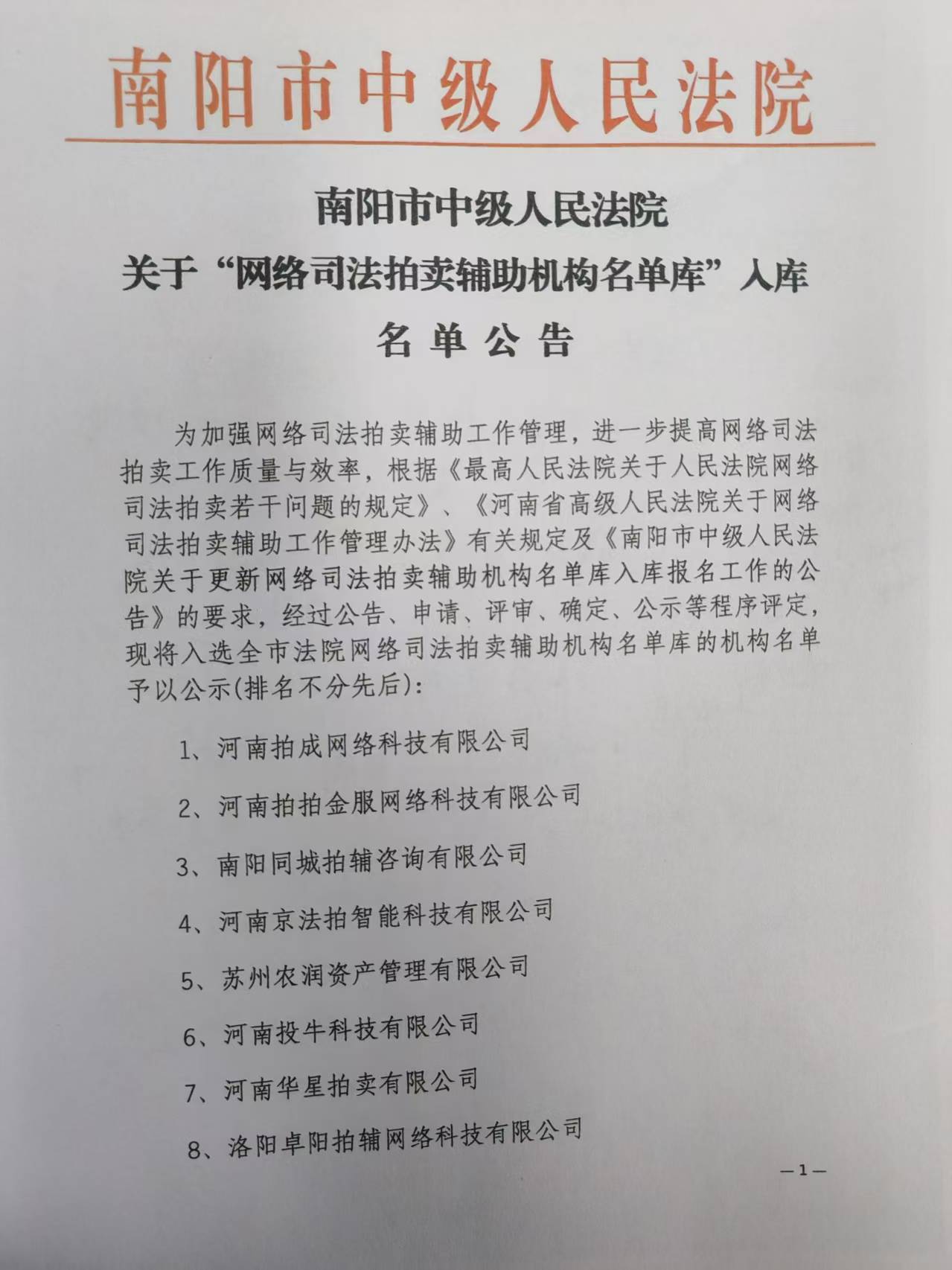 公司入選南陽(yáng)中級法院網(wǎng)絡(luò )司法拍輔機構名單庫