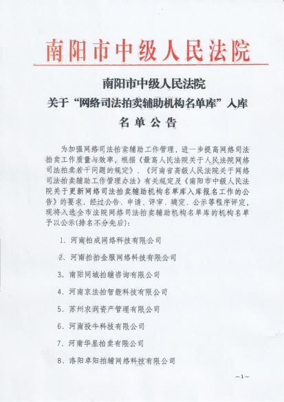 公司入選南陽(yáng)中級法院網(wǎng)絡(luò )司法拍輔機構名單庫